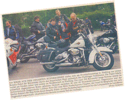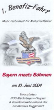 Für den 10.06.03 organisierte unser Chaptermitglied Peter Erl die 1. Benefizfahrt durch den Bayerischen Wald. Der Erlös dieser Veranstaltung wurde dazu verwendet, an unfallträchtigen Stellen die Leitplanken zu entschärfen, um die Verletzungsgefahr bei Motorradunfällen drastisch zuverringern.